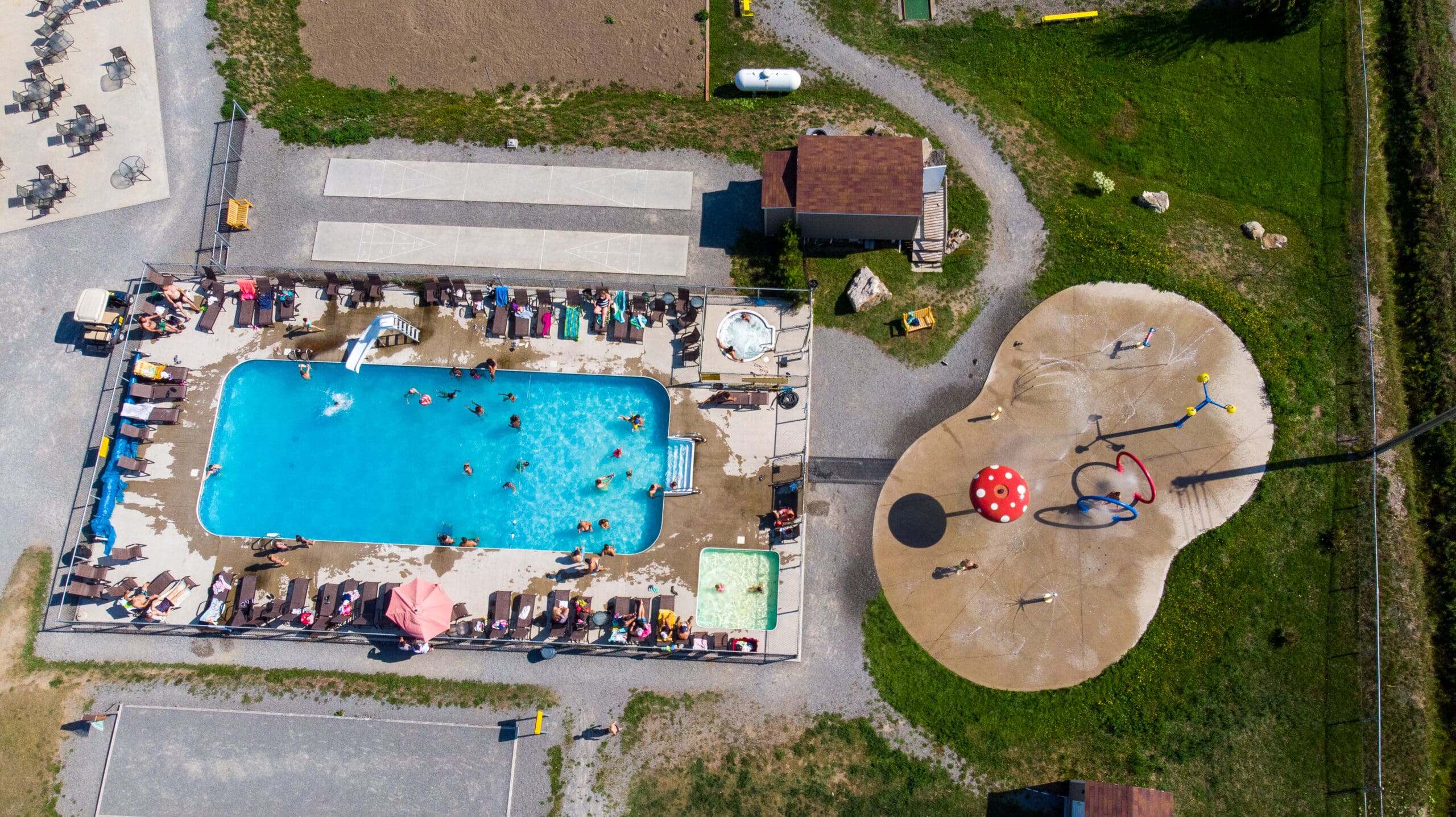 If you want some fun, this is the place to be! The campground offers a giant trampoline, a large heated swimming pool with slide, a wading pool, water games, a spa, a playground, shuffleboard, a magnificent sandy beach and a marina, kayak, canoe and paddle board rental, mountain hiking, cycling, themed weekends, entertainment for children during the week, petanque and many more! Enjoy the campers’ room: music, fitness and games. Dogs have fun in our dog park… or simply have a good time or a good meal at the Domaine Lac St-Mathieu.